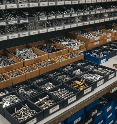 Dobradiças, fechaduras, trincos, parafúsos e acessórios esenciais para montagem e fixação.